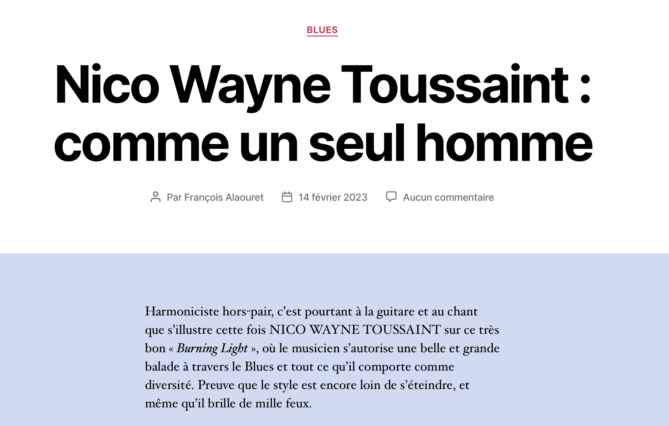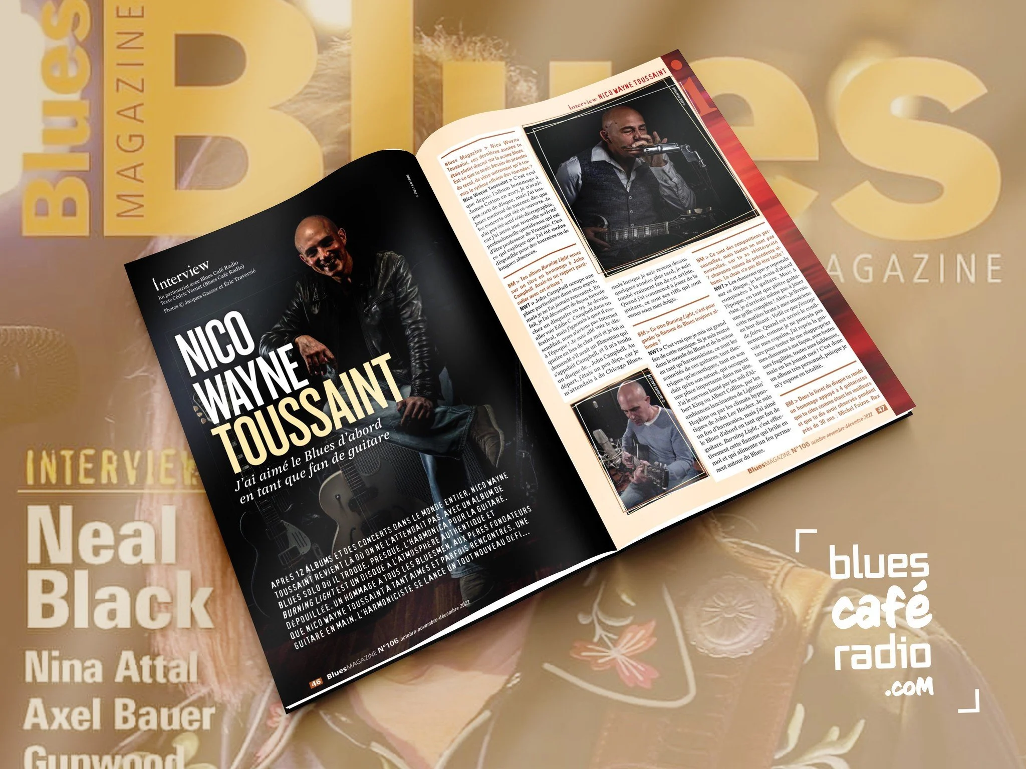 Je m’appelle Nico Wayne Toussaint et cela fait 25 ans que je monte sur scène avec mon groupe pour jouer du blues, en tant que leader, harmoniciste et chanteur. Le blues, pour moi, ça a commencé par un coup de foudre pour Muddy Waters et son harmoniciste James Cotton quand j’avais quinze ans. Jouer du blues avec une guitare est dès lors devenu un rêve secret que j’ai mis plus de 30 ans à réaliser.